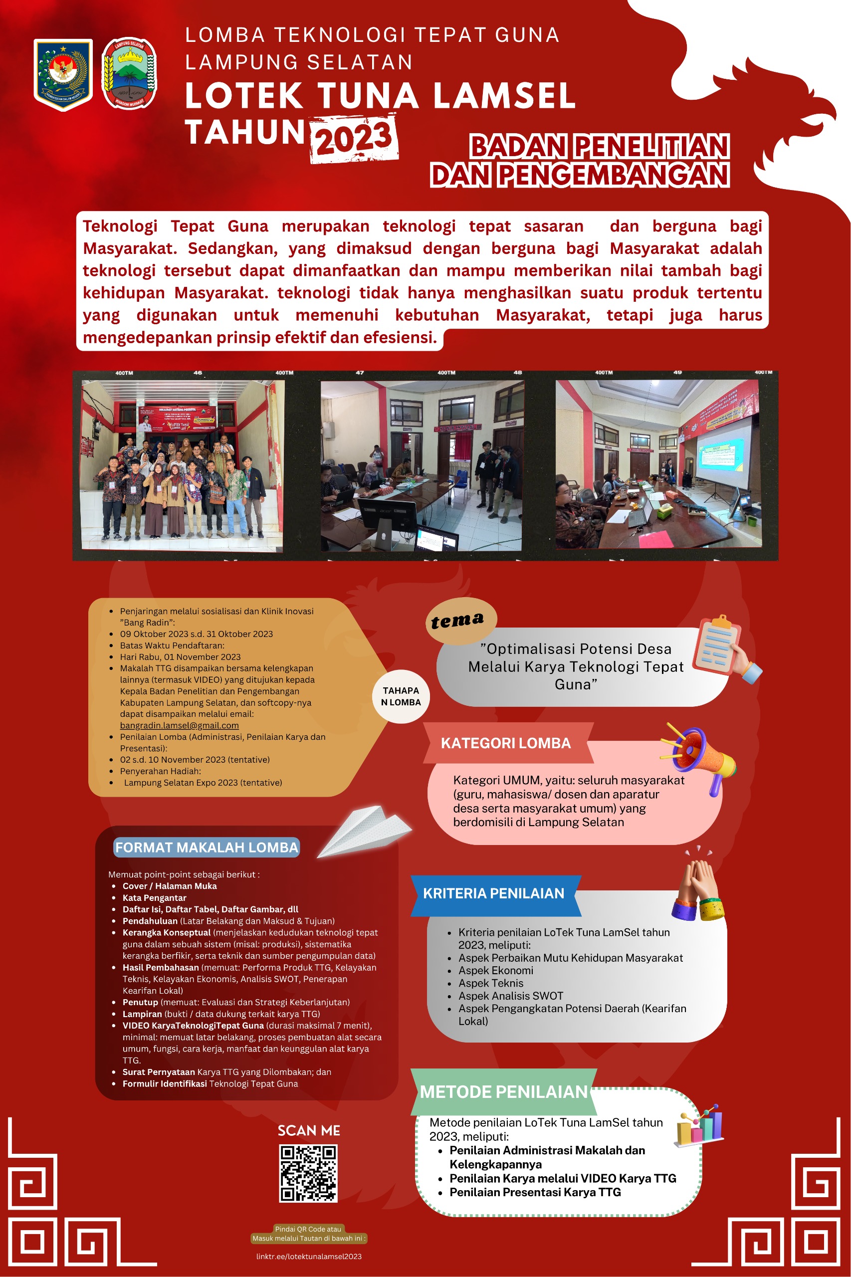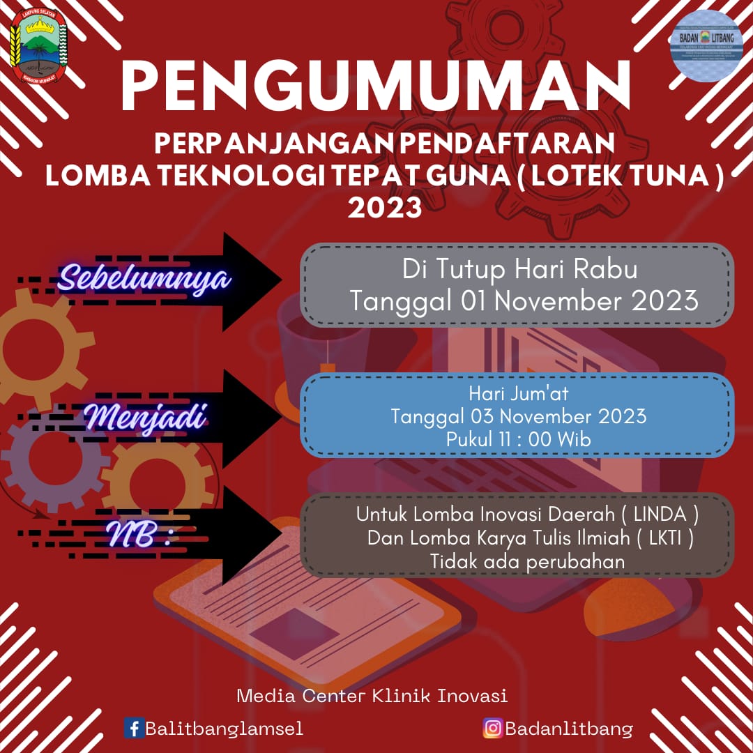 “Iya, terdapat perpanjangan masa pendaftaran Lomba Teknologi Tepat Guna, dalam rangka mengakomodir permintaan masyarakat,” ujar Kepala Balitbang Kabupaten Lampung Selatan M Yusuf, Rabu 1 November 2023.