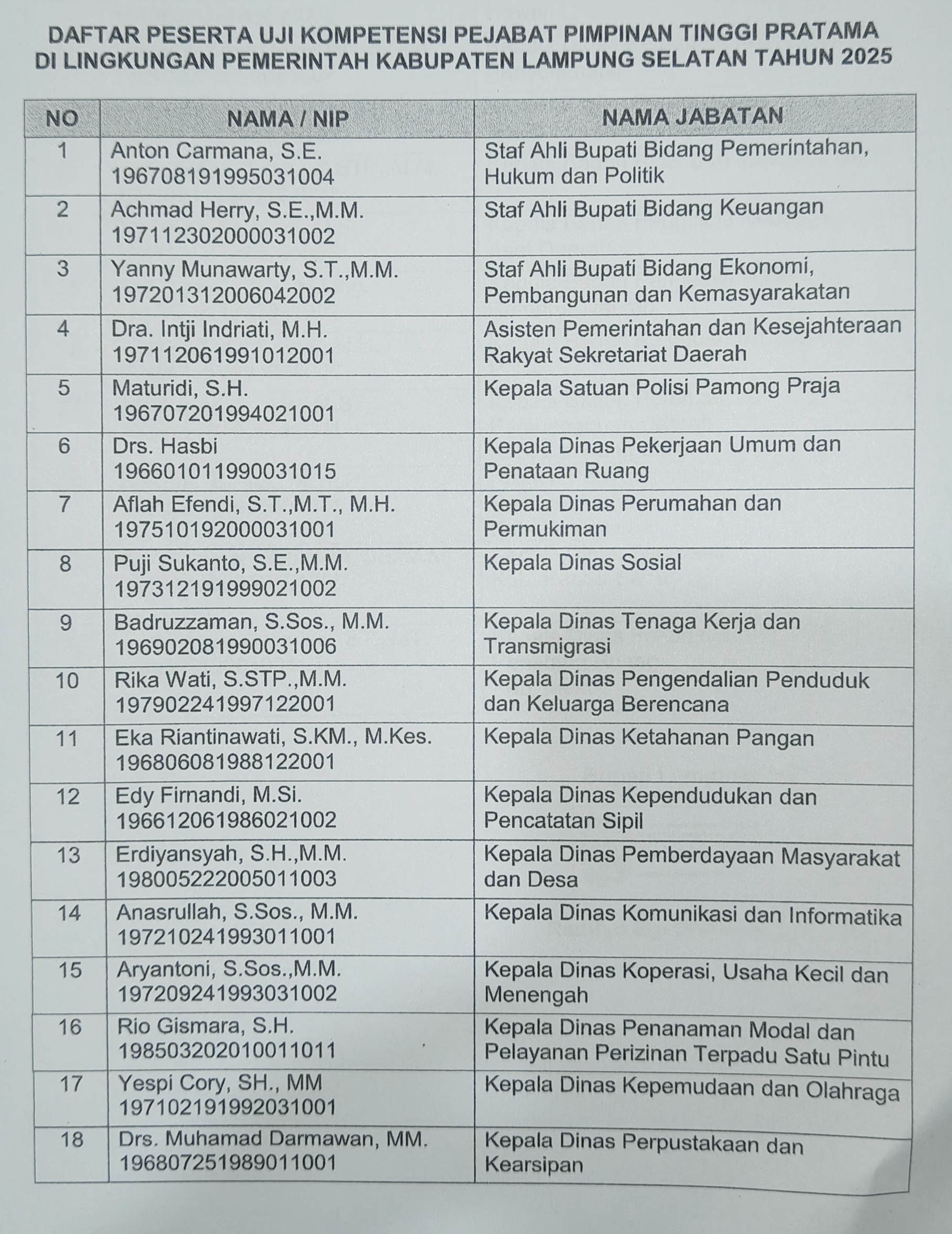 BERITAKITA.CO.ID, Lampung Selatan – Sejumlah nama pejabat eselon II di lingkungan Pemkab Lampung Selatan, tak tercantum dalam daftar peserta Jobfit atau uji kompetensi (Ukom).