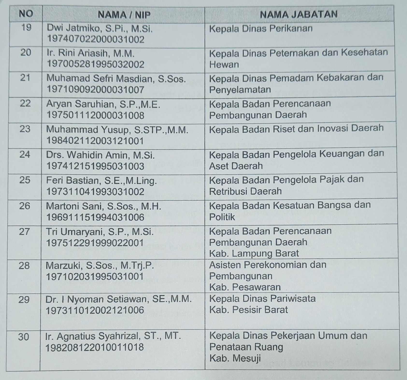 Dia adalah, Tirta Saputra yang menduduki jabatan Kepala Badan Kepegawaian dan Diklat (BKD), Hendra Jaya Kepala Dinas Perdagangan dan Perindustrian (Disdagperin). Lalu, Yudhius Irza Kepala Dinas Lingkungan Hidup (LH) dan Harizzon Kepala Dinas Perhubungan (Dishub).