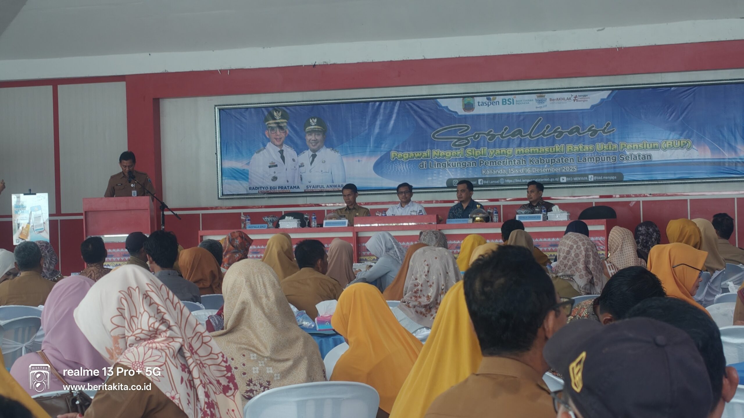 BERITAKITA.CO.ID, Lampung Selatan – Badan Kepegawaian dan Diklat (BKD) Kabupaten Lampung Selatan menggelar sosialisasi layanan pensiun Pegawai Negeri Sipil (PNS) terpadu, Senin 15 Desember 2025.