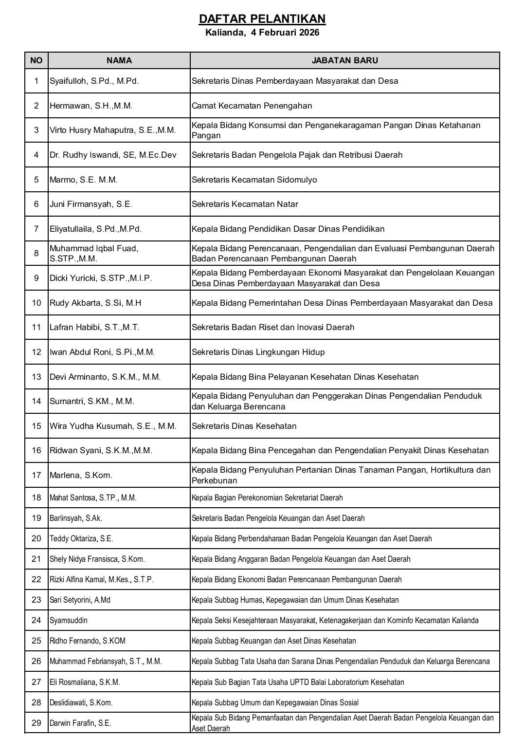 Mereka yang dilantikan adalah pejabat administrator dan pengawas. Berdasarkan data dihimpun, terdapat 29 pejabat yang dilantik. Selain itu, terdapat sejumlah pejabat yang mendapatkan amanah tambahan sebagai pelaksana tugas (Plt), jumlahnya 34 orang.