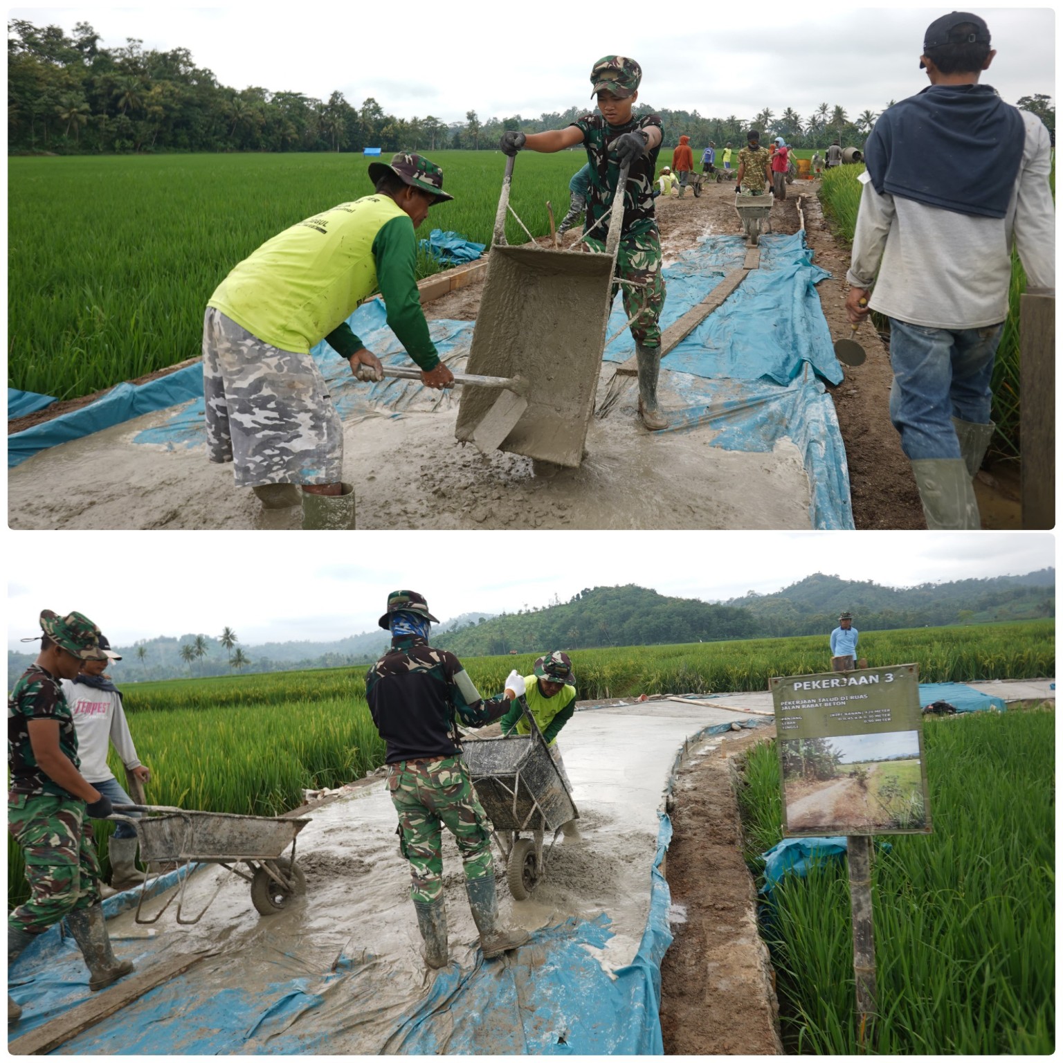 Di lokasi kegiatan, prajurit bersama warga tampak bahu-membahu mengangkut adukan semen menggunakan angkong menuju titik pengecoran.
